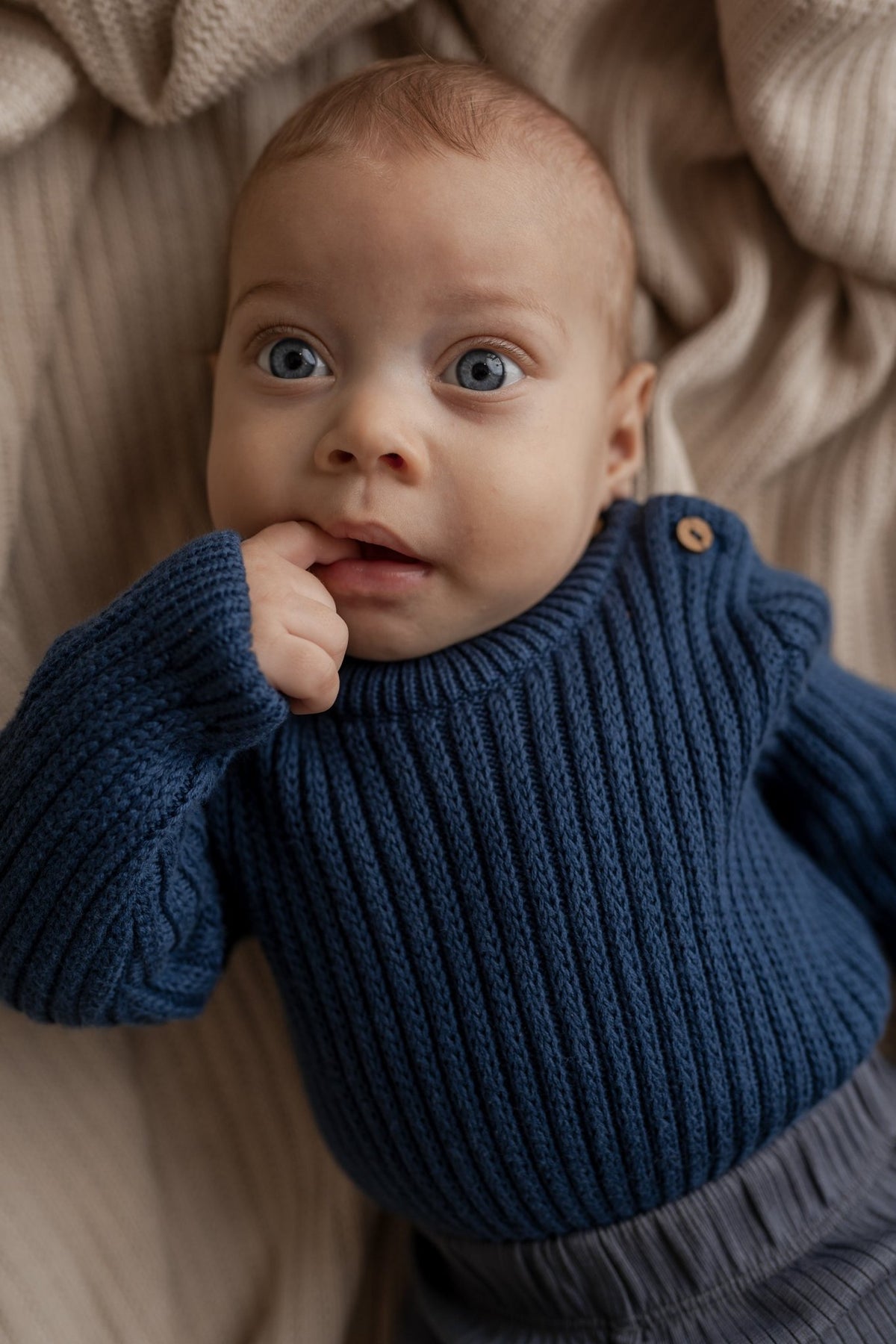Den er strikket i et vakkert stripemønster i blåtonen Ensign Blue, med klassisk passform og tidløst uttrykk.