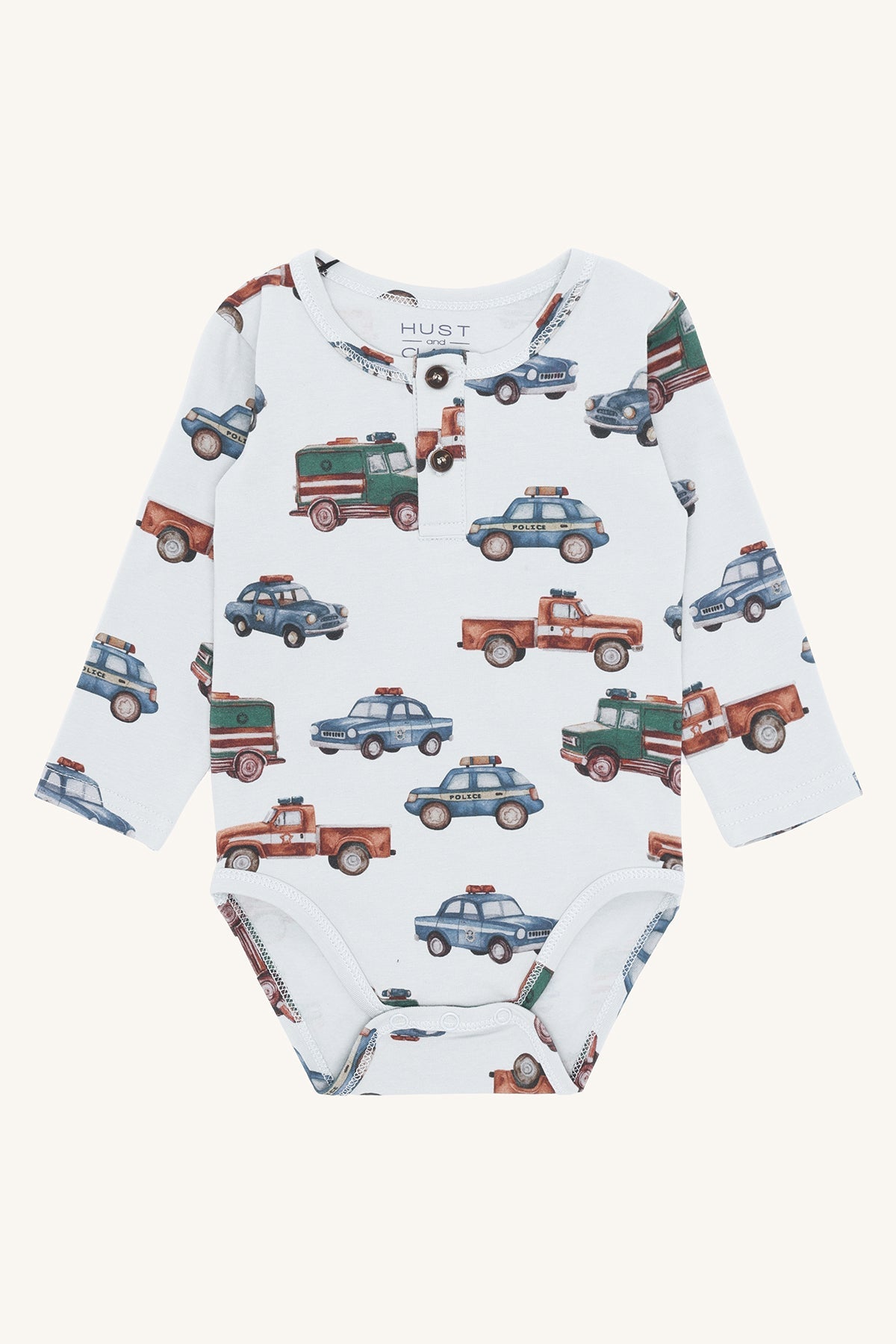 En supermyk og morsom body fra Hust and Claire! Billy Placket Policecar kommer med et helprint av politibiler, ambulanser og andre biler – perfekt for små som elsker alt som ruller. Bodyen har praktisk knappestolpe foran og trykknapper nederst for enkel av- og påkledning.