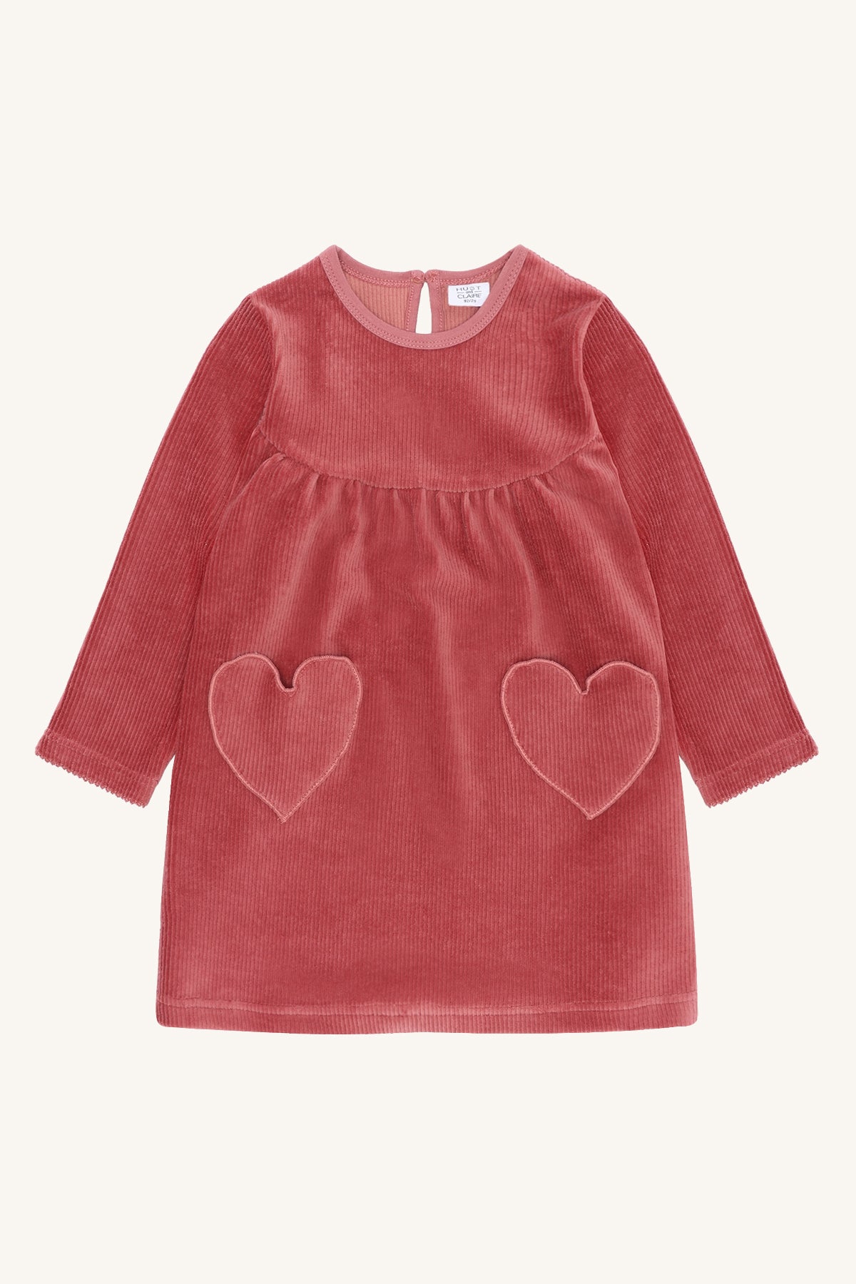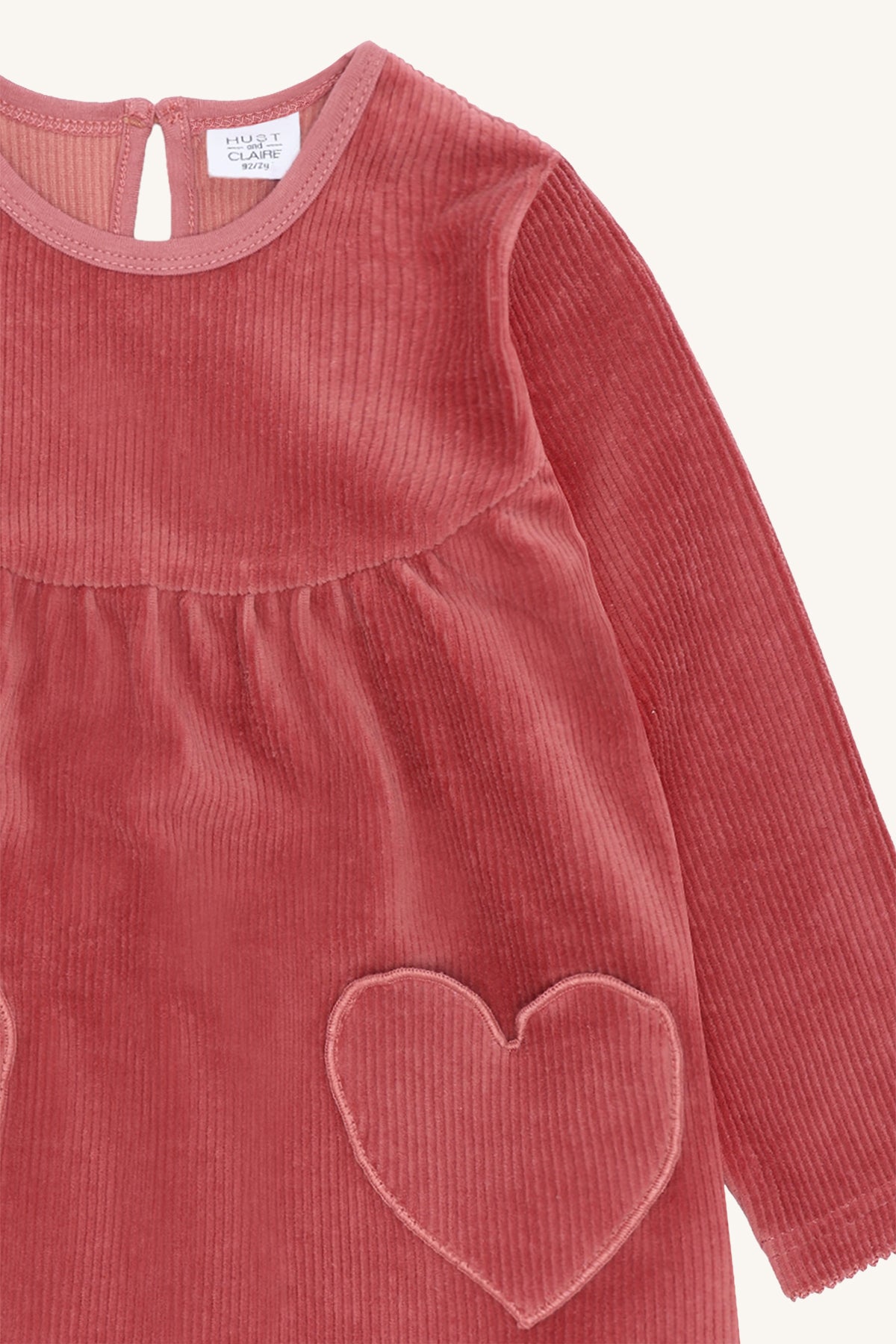 En nydelig og komfortabel velourkjole for barn! Hust and Claire sin Donna kjole er laget i myk ottoman-velour i en varm rosafarge (Dry Rose), og har to søte hjerteformede lommer foran. Perfekt både til hverdags og til festlige anledninger.