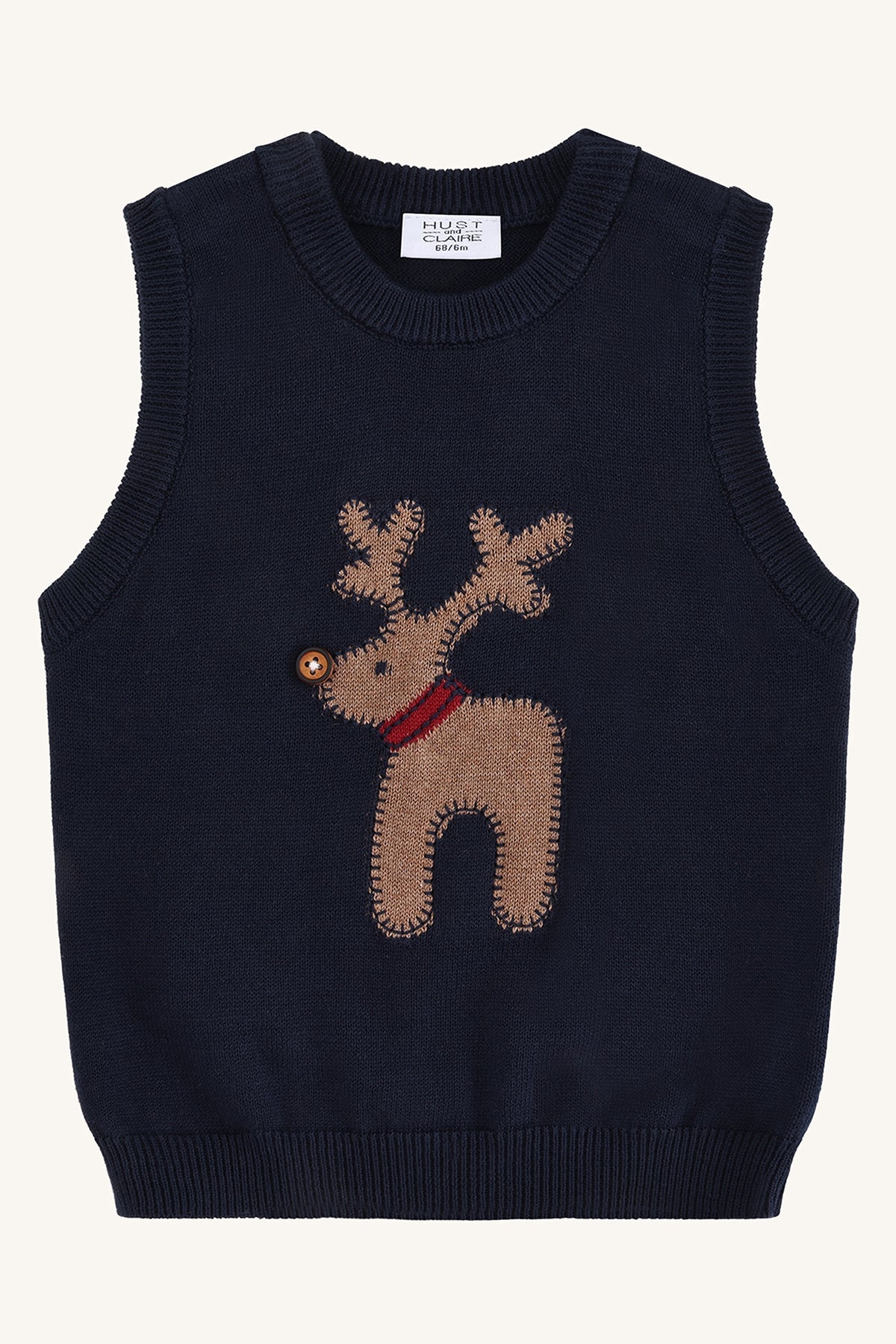 Festlig og koselig strikkevest fra Hust & Claire – perfekt til julens små og store øyeblikk! Perry Deer-vesten i fargen More Navy er laget i myk, økologisk bomull og har et søtt reinsdyrmotiv med et lite, tredimensjonalt nese-detalj.