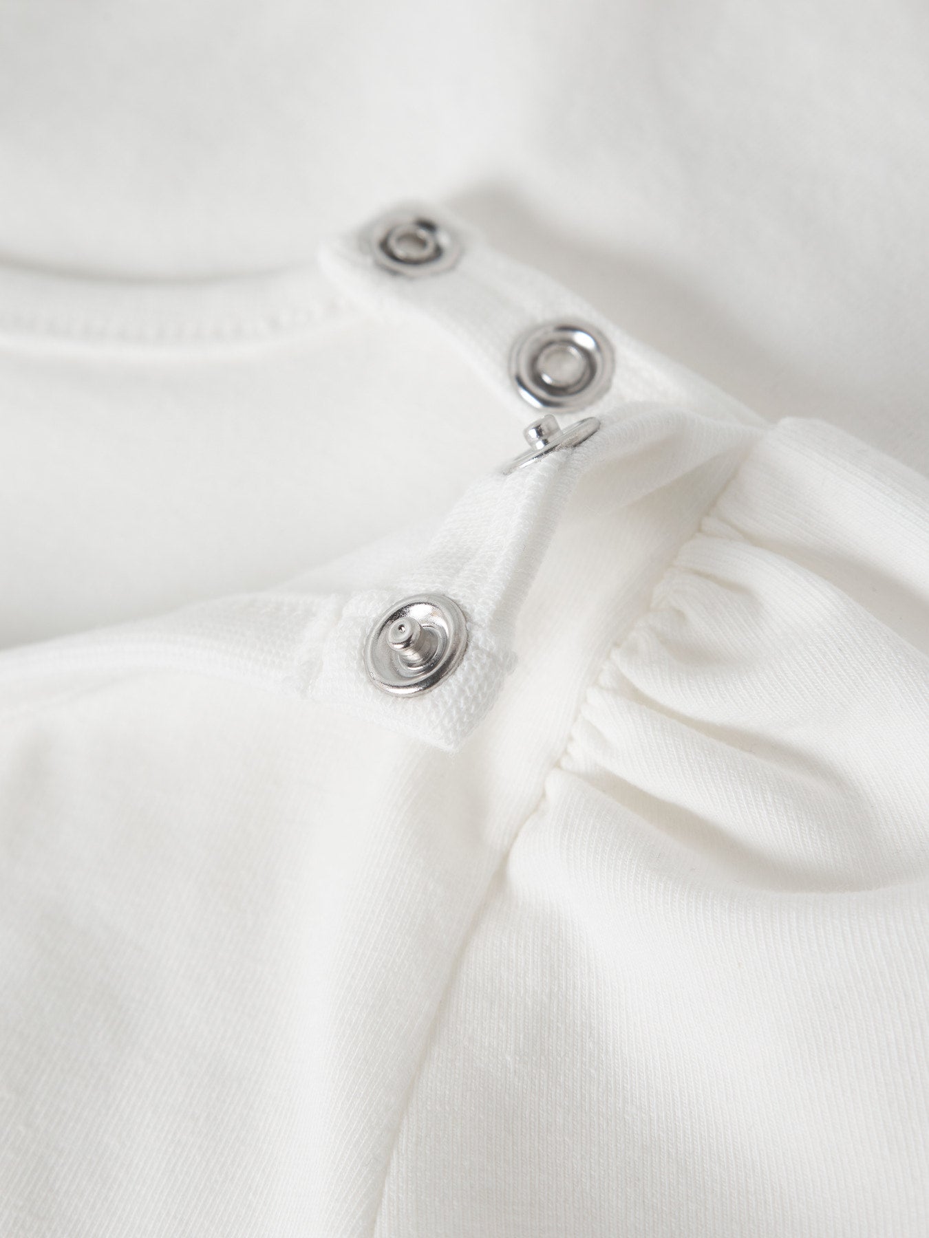 Bodyen har lange puffermer, rund hals og praktisk trykknapplukking som gjør den enkel å ta av og på. En nydelig broderidetalj foran gir et ekstra søtt og tidløst preg.