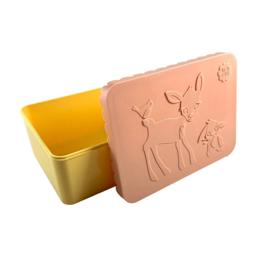 Gul matboks med lokk i ferskenfarge og søtt rådyrmotiv – en praktisk og barnevennlig løsning for små måltider på farten.