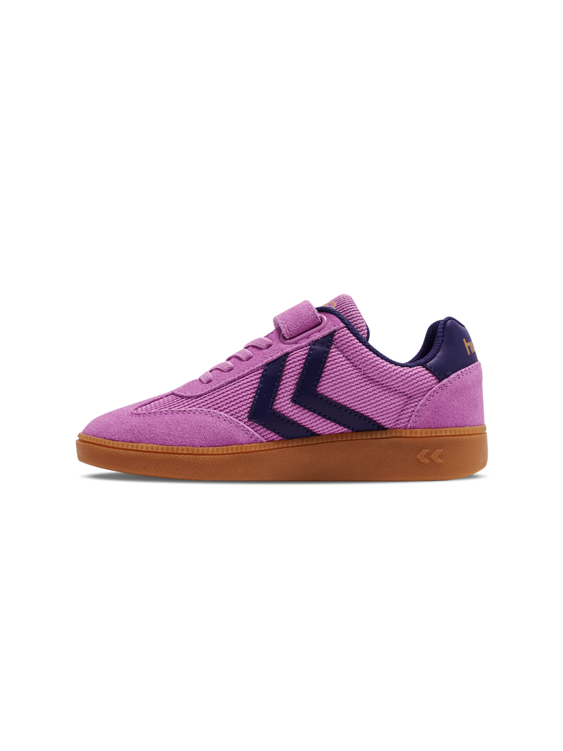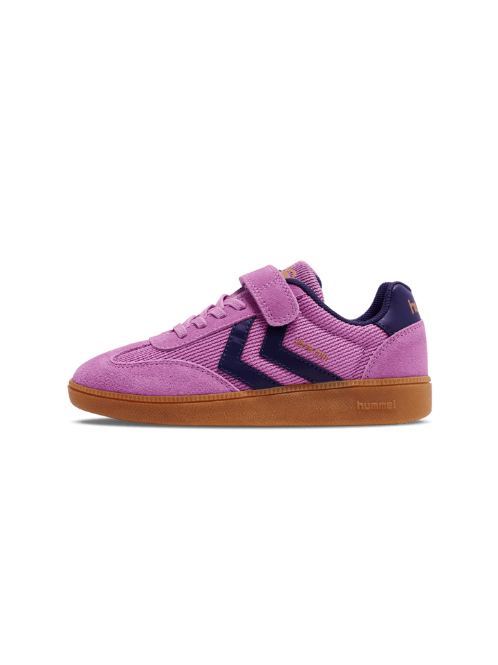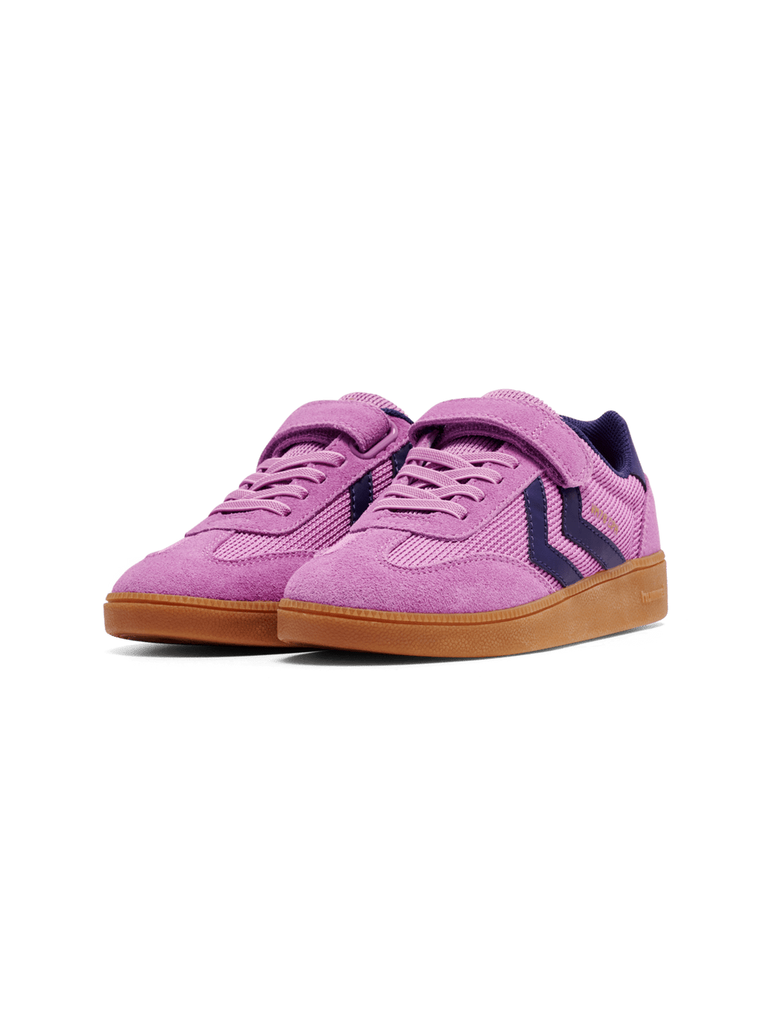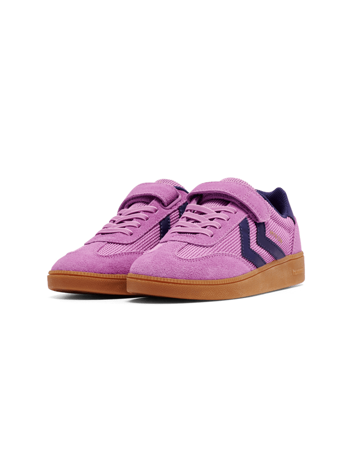 Gi antrekket et friskt preg med Hummel VM78 CPH JR i en herlig fiolett farge! Disse sneakersene kombinerer semsket skinn og pustende mesh for en stilig og komfortabel hverdagssko. Perfekte for både skole og fritid, med lett konstruksjon og slitesterk yttersåle som tåler aktiv bruk.