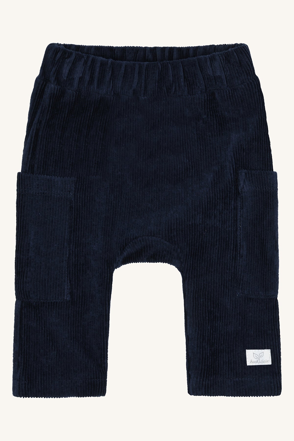 Stilren bukse i myk kordfløyel fra Hust and Claire. Denne mørkeblå varianten har en klassisk look med volangdetalj i livet og dekorative sømmer ved knærne. Laget i 100 % bomull, perfekt for både barnehage og hverdagsbruk. Den elastiske midjen gir god komfort og passform for aktive små.