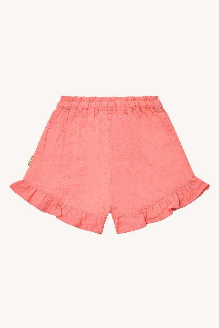 Disse søte shortsene er perfekte for små sommerdager! Laget av 100% økologisk bomull, er de lette og behagelige å ha på seg. Den elastiske midjen med snøring sørger for en god passform, og volangkanten nederst gir et ekstra sjarmerende preg. Den justerbare midjen gjør det enkelt å tilpasse passformen etter behov. Perfekt for lek og moro i solskinnet!