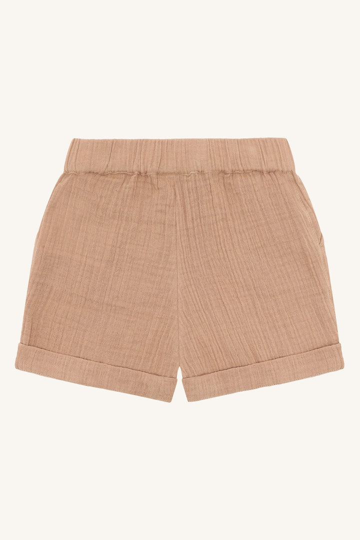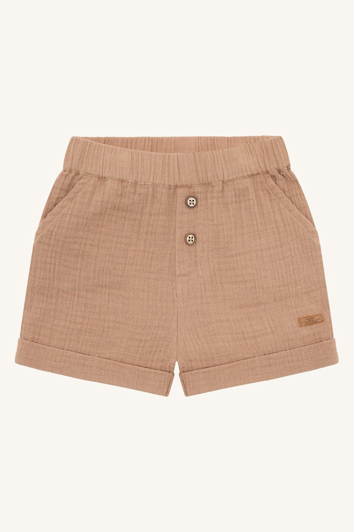 Disse shortsene i vevd bomull er perfekte for varme dager! Det myke stoffet og den elastiske strikken i midjen sørger for god komfort og bevegelsesfrihet. Sidelommene gir plass til små skatter, og de dekorative knappene foran gir et stilig preg. De oppbrettede bena gir et avslappet og sommerlig utseende, og den justerbare midjen sikrer en perfekt passform. Laget av 100 % økologisk bomull, er de et godt valg for både barnet og miljøet.