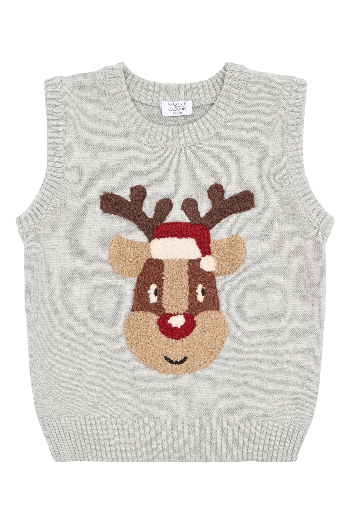 Klassisk og sjarmerende strikkevest fra Hust & Claire, laget i 100 % økologisk bomull. Den søte reinsdyrapplikasjonen foran gjør denne vesten perfekt til julens koselige anledninger – enten det er julaften, fotografering eller familieselskap. Myk, varm og behagelig mot huden – like fin over en skjorte som over en genser.