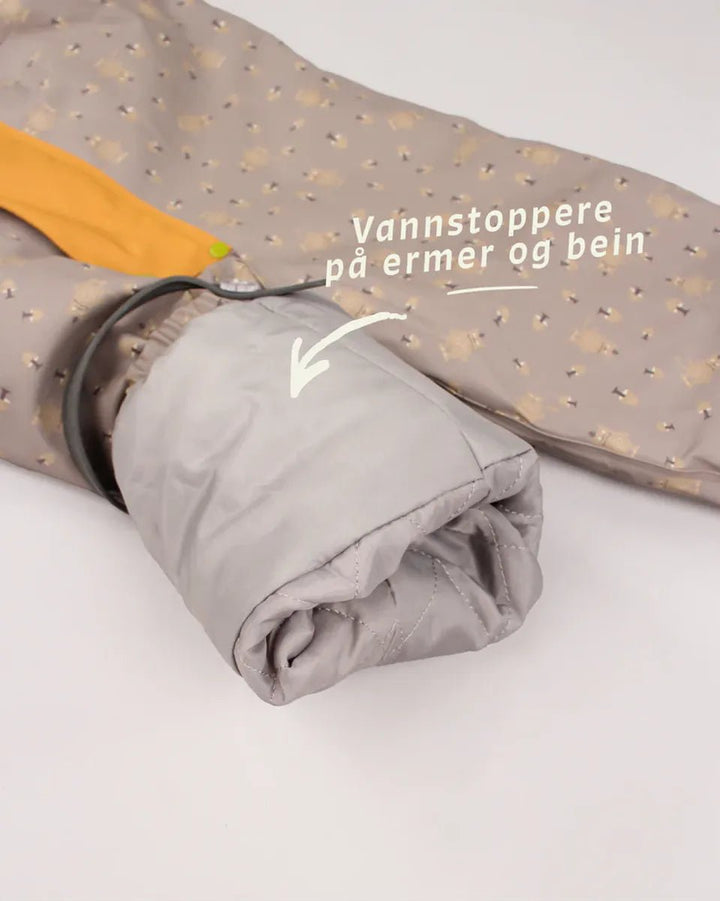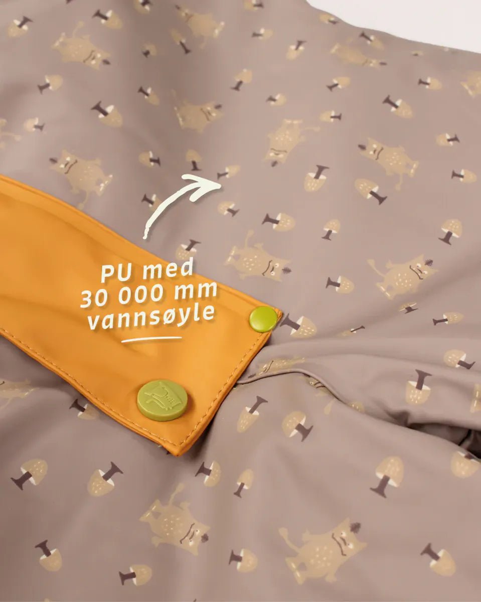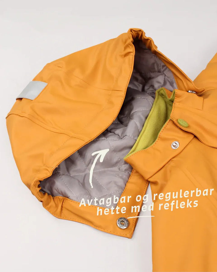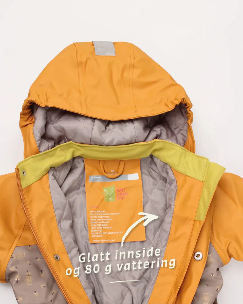 Denne fargeglade regndressen i honninggul har myk og fleksibel PU-knit i overdelen, mens nedre del er laget i slitesterk PU-ekstrem som tåler sølepytter, regnvær og mye lek. Den er utstyrt med vanntett glidelås for ekstra beskyttelse, og 80 gram vattert fôr som holder barnet varmt og tørt på våte høstdager og i slapsete vintervær.