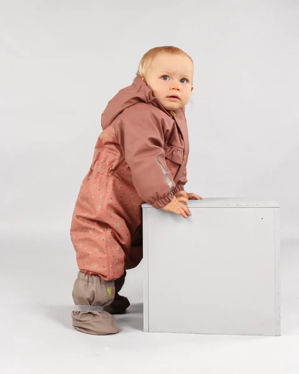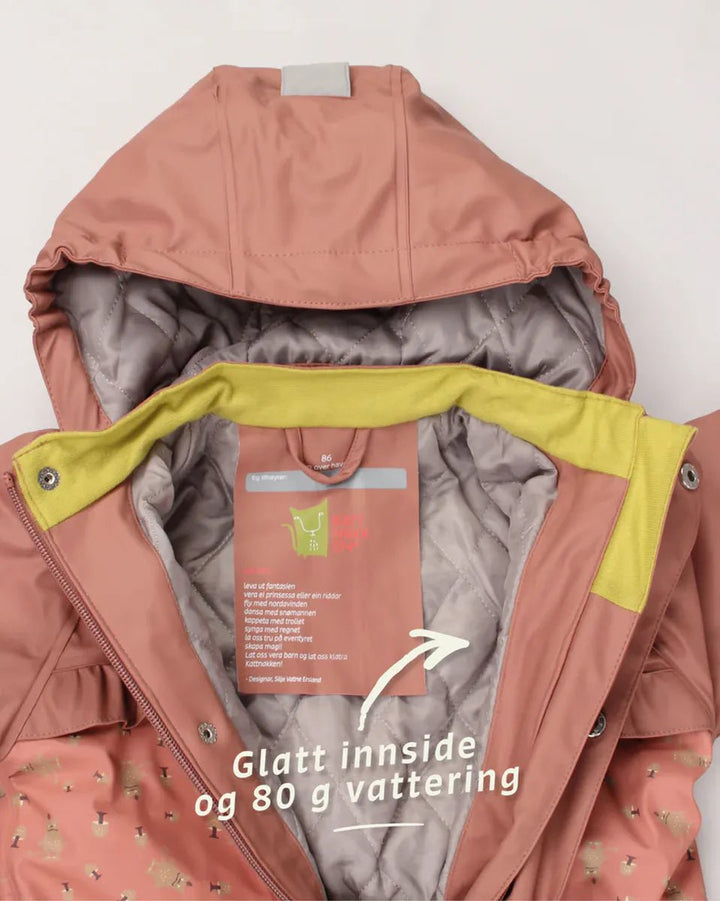 Dressen har myk og lett PU-knit i overdelen, mens nedre del er laget i slitesterk PU-ekstrem som tåler ekstra røft vær og aktiv lek. I tillegg har den vanntett glidelås for ekstra beskyttelse mot sølepytter og regn. Det vatterte fôret på 80 gram gjør dressen ideell på dager med pøsregn, høststorm eller slapsete vintervær.