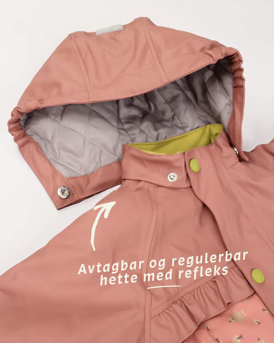 🌿 Regntøyet er håndprintet, og det kan derfor forekomme små variasjoner i mønsteret – dette påvirker ikke kvaliteten i stoffet.