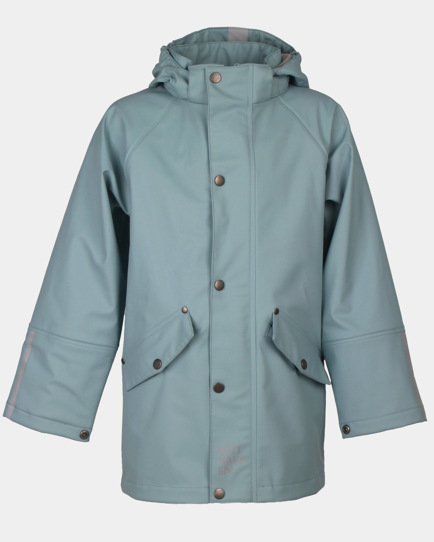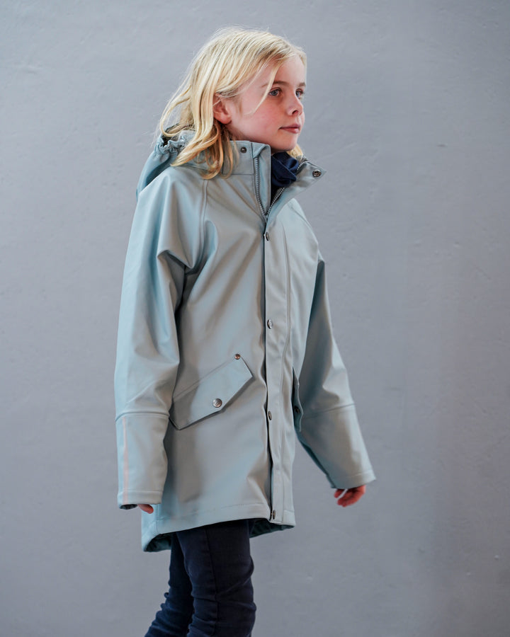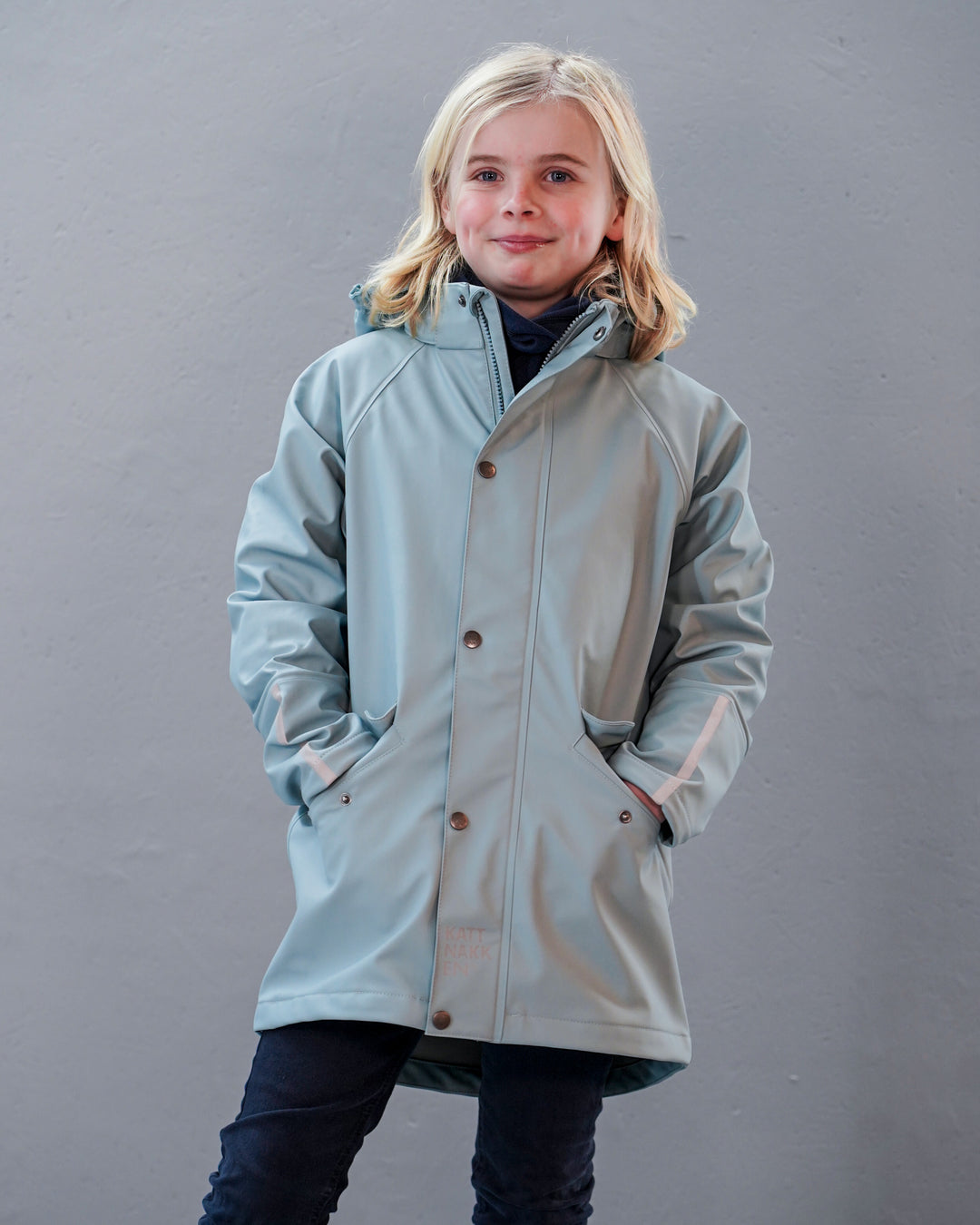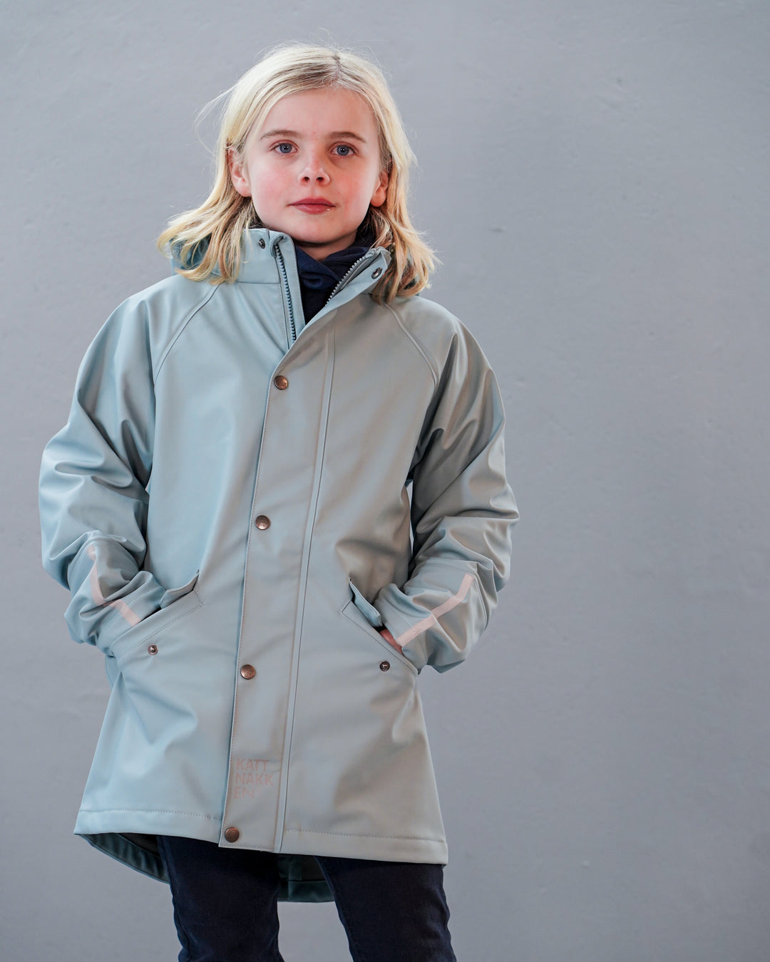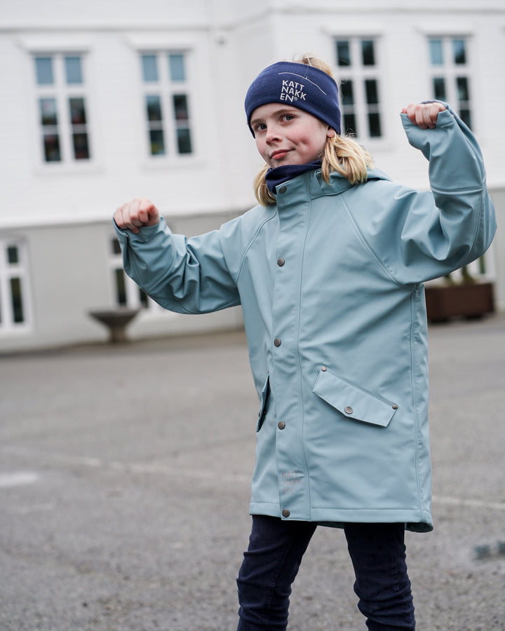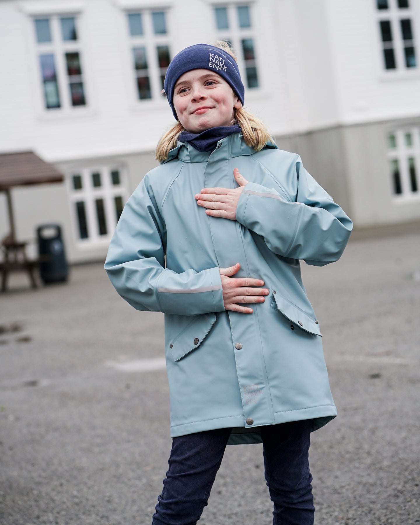 Innside i børsta polyester gjør jakken ekstra myk og behagelig å ha på. Den har vannstopper på ermer, navnelapp og gode lommer foran – perfekt til regnværsdager på skolen eller ute på tur!