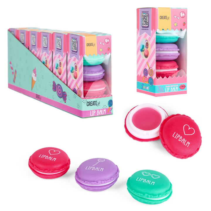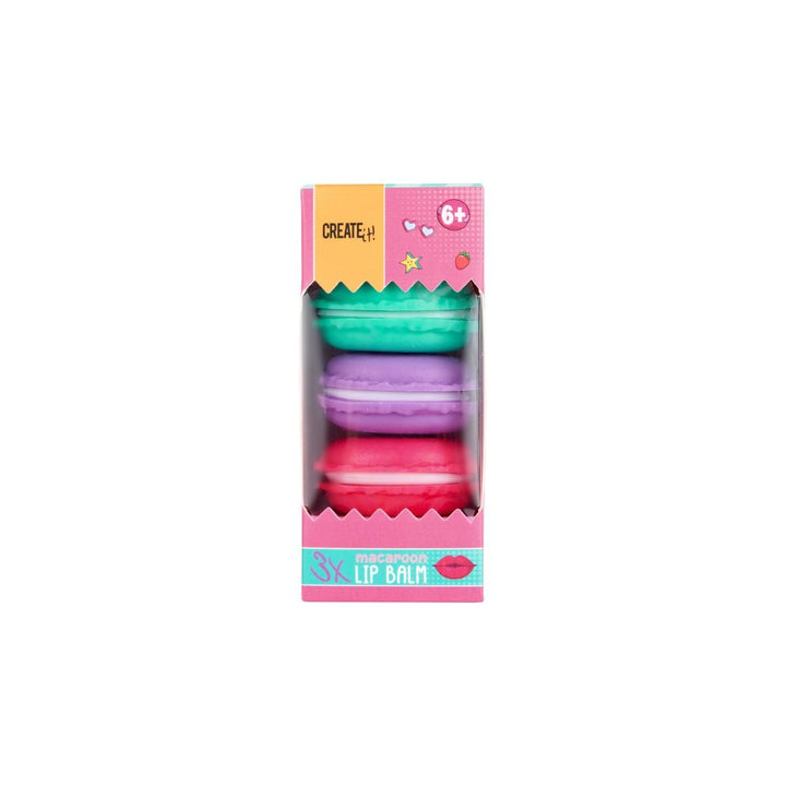 Gjør hverdagen litt søtere med dette morsomme settet med tre makronformede leppepomader fra Create It! Perfekt for små sminkeelskere og som gave.