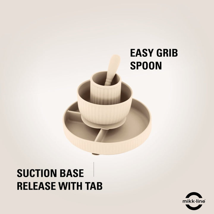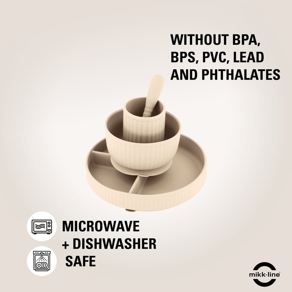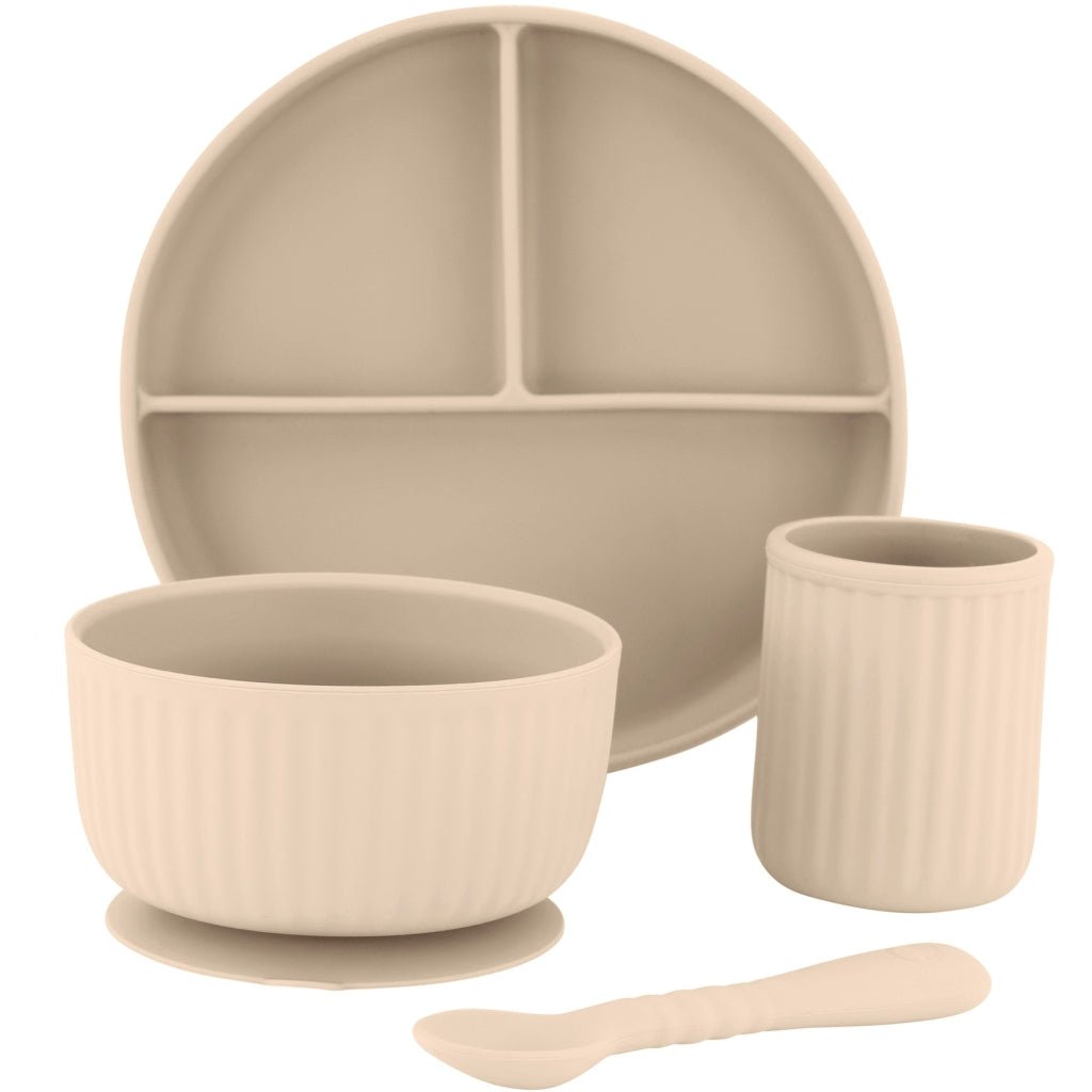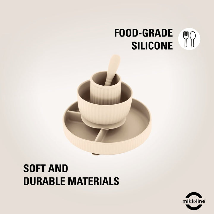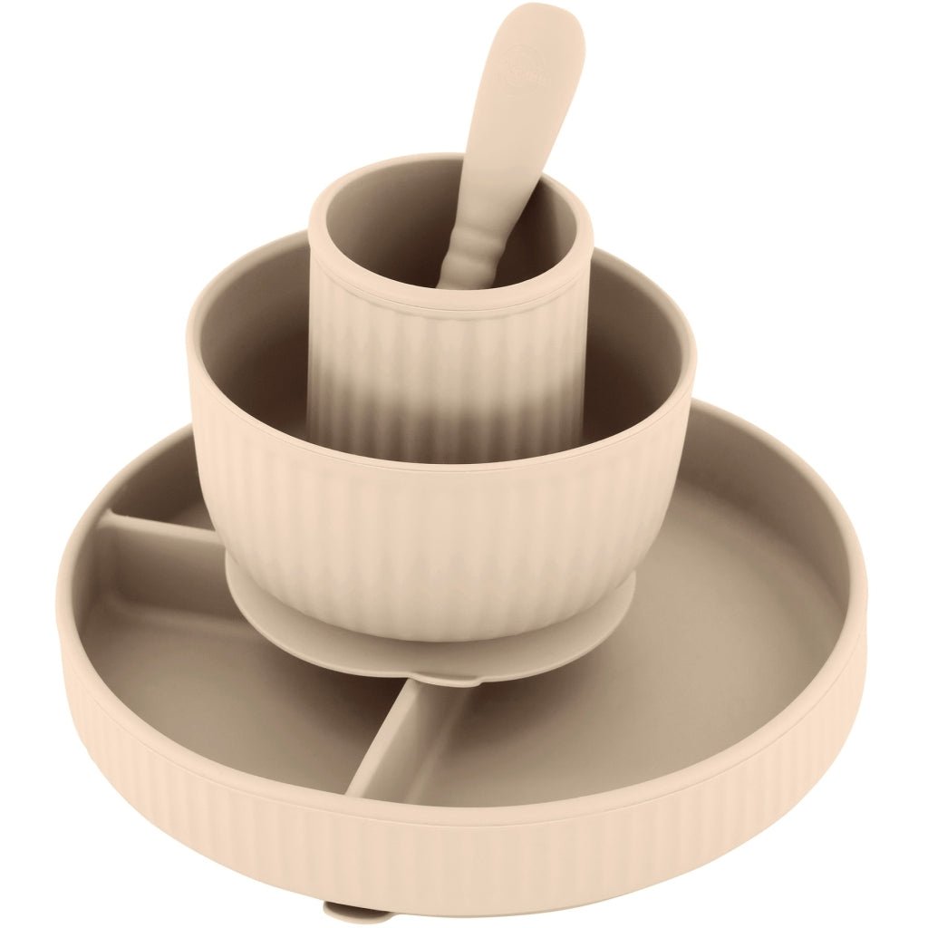 Komplett middagssett i elegant White Swan-farge – perfekt for små barn som skal lære å spise selv. Settet inneholder delt tallerken, bolle, kopp og skje – alt i samme myke og nøytrale fargetone. Laget i 100 % trygg silikon som tåler hverdagsbruk og oppvaskmaskin.