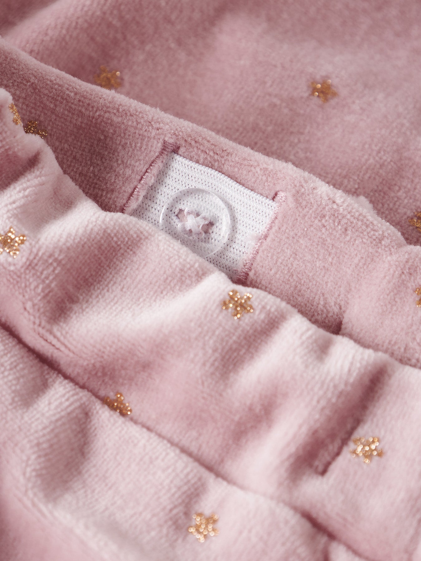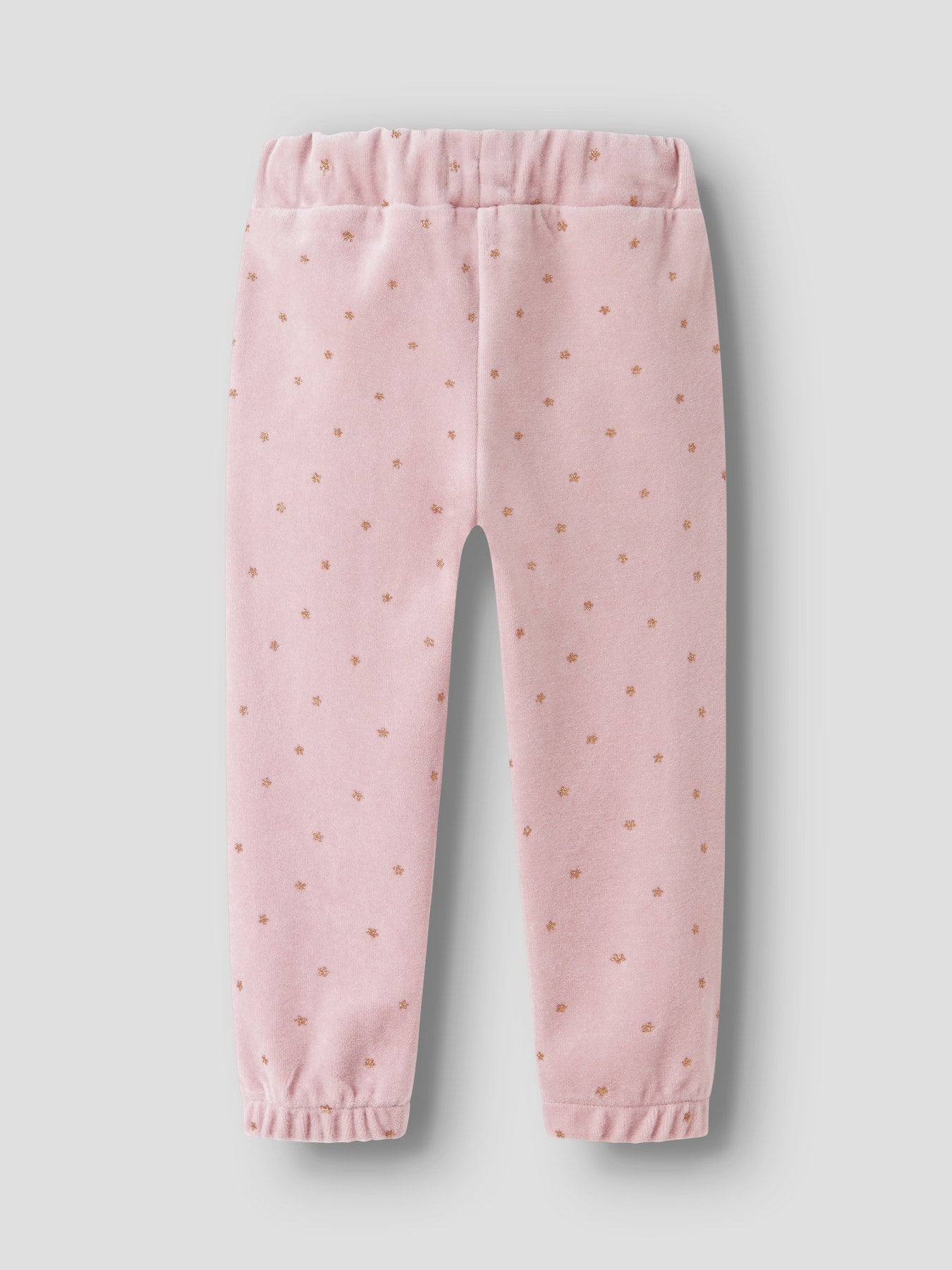 Joggebuksene har middels høy midje, justerbar strikk og en søt sløyfedetalj foran. Et glitrende glitterprint gir en morsom og festlig touch – ideelt for små fashionistaer som vil ha både komfort og stil.
