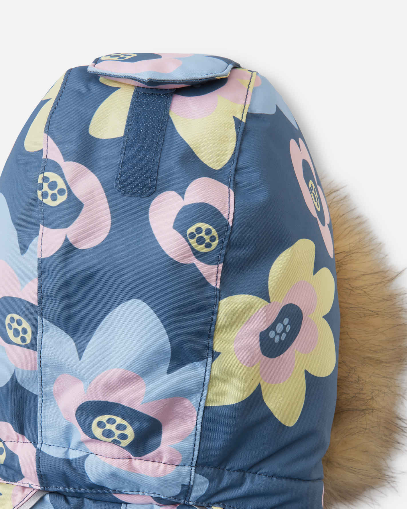 Lappi har en lang glidelås som gjør påkledning superenkelt, og et glatt polyesterfôr som føles behagelig mot huden. Den avtakbare hetten med fuskepelskant beskytter mot vind og snø – og løsner trygt hvis den skulle hekte seg fast. Elastiske fotstropper i silikon holder buksebena på plass, slik at snøen holdes ute.