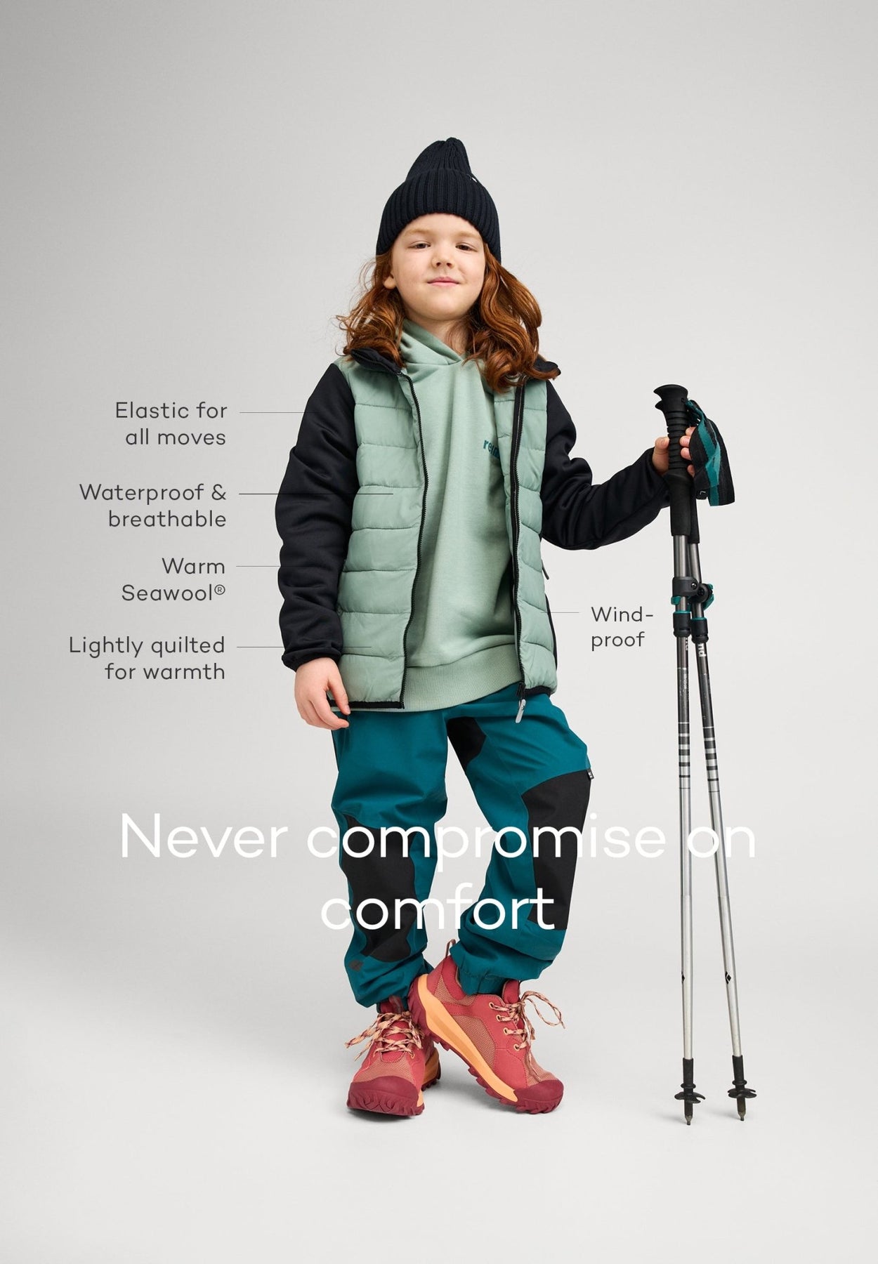 Den lett vatterte overdelen er laget i vind- og vannavvisende materiale som beskytter mot vær og vind, samtidig som stoffet puster godt. Sidepanelene i myk fleece inneholder innovative Seawool®-fibre laget av resirkulerte, finmalte østersskjell, noe som gir ekstra varme og høy komfort.